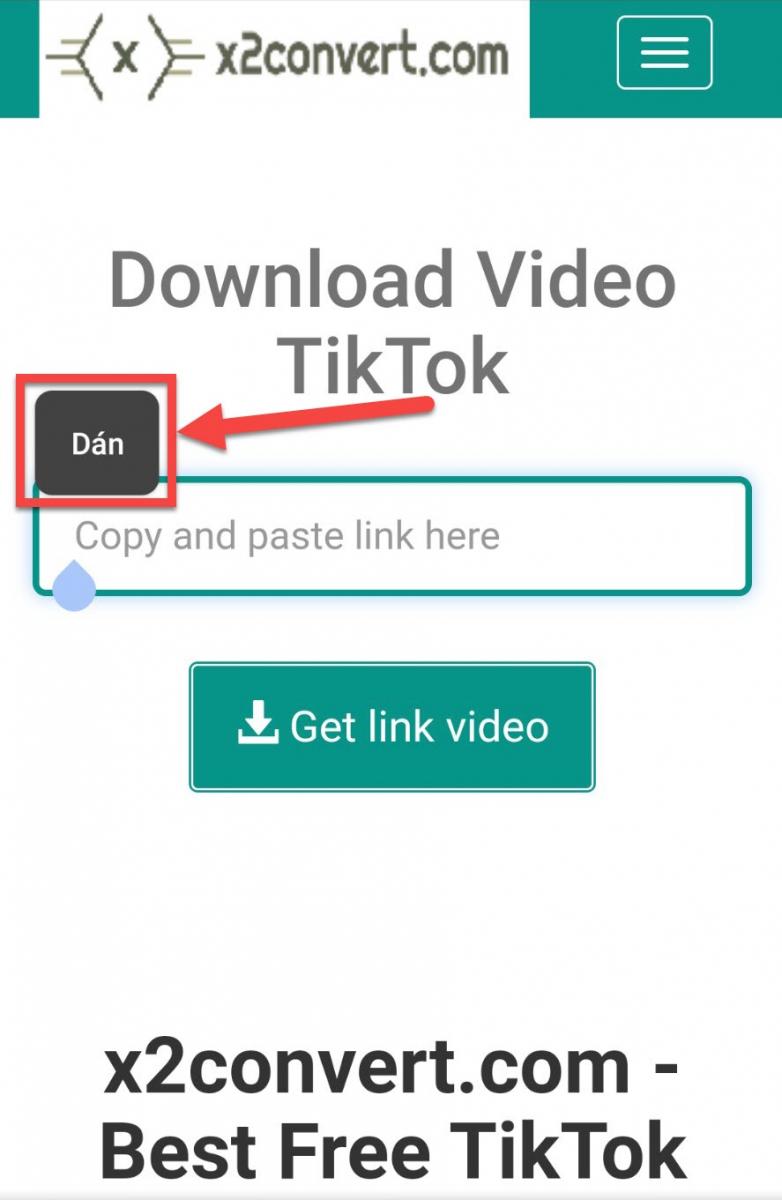 Bước 3: Sau khi truy cập vào website tại ô có chữ Copy và dán link vào đây bạn chạm vào đó và giữ một lúc, chữ Dán sẽ xuất hiện, bạn click vào đó nó sẽ paste url TikTok mà bạn vừa copy ở Bước 2 vào ô đó. Sau đó bạn click vào chữ Lấy link video.