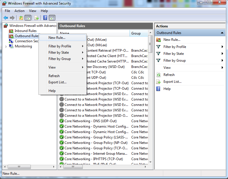 Tại cửa sổ mới hiện lên, bạn click chọn Outbound Rules, sau đó click chuột phải vào nó và chọn New Rule...