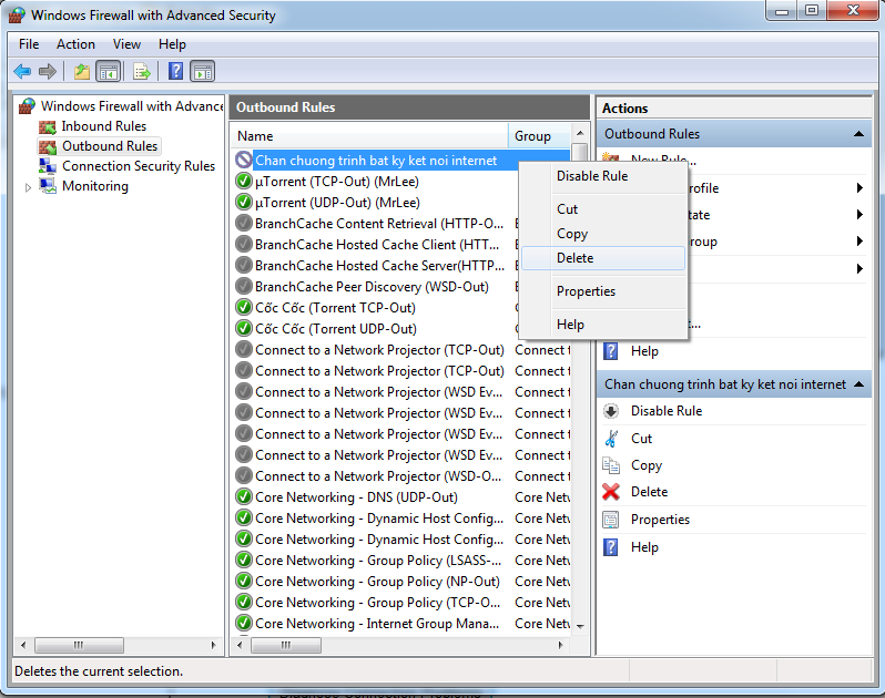 Để IE có thể kết nối Internet trở lại, bạn click chuột phải vào tên Rule vừa tạo, chọn Delete