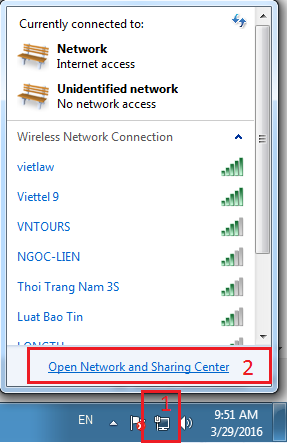 Bước 1: Tại thanh menu phía dưới của Windows, bạn click vào biểu tượng đang kết nối mạng (hình cái màn hình máy tính, biểu tượng wifi...) sau đó click vào Open Network and Sharing Center