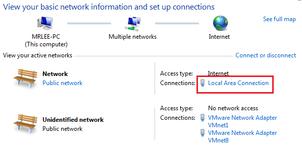 Màn hình hiển thị thông tin kết nối mạng, bạn click vào Local Area Connection tại địa chỉ mạng bạn đang kết nối