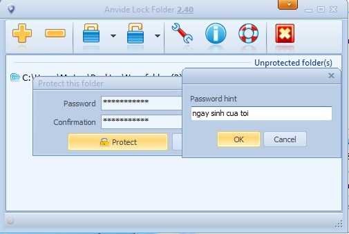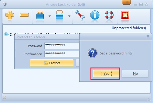 Bước 6: Anvide Lock Folder sẽ hỏi bạn có cần thiết lập gợi ý trong trường hợp quên mật khẩu không, click Yes