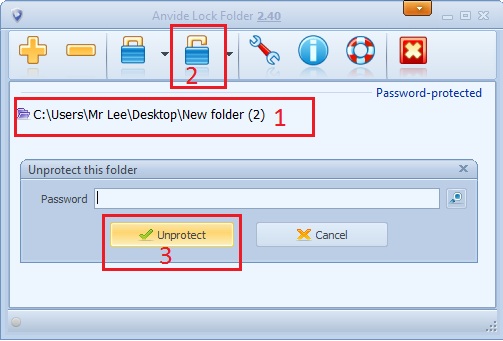 Để hiển thị lại thư mục bạn click chọn thư mục cần mở, click vào biểu tượng mở khóa sau đó nhập mật khẩu >> Unprotect là xong