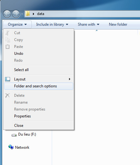 Vào folder có file bị ẩn đó, click chọn Organize -> Folder and search options