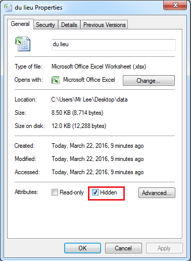 Tại tab General, bạn bỏ tích tại ô Hidden
