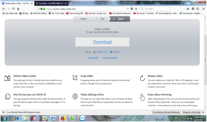 Bước 4: Sau cùng chọn  Cut the Video và chờ hoàn tất quá trình sau đó bấm tải về dưới mục Processed video để lưu.