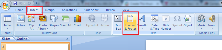 Bước 1: Tại PowerPoint 2007 bạn click chọn Insert >> Header & Footer