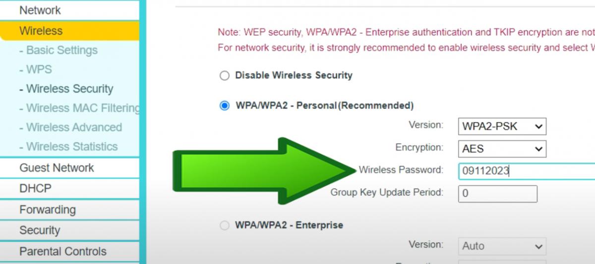 Bước 3: Chọn mục "Wireless" và chọn "Security" để thay đổi mật khẩu wifi.