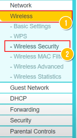 Bước 3: Chọn mục "Wireless" và chọn "Wireless Security" để thay đổi mật khẩu wifi.