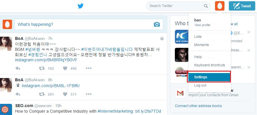 Bước 1: Bạn đăng nhập vào tài koản Twitter, click vào Profile and Settings >> Settings