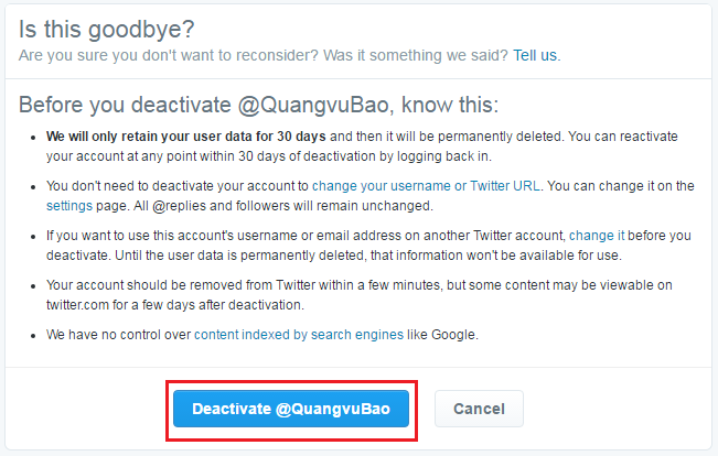 Vậy là tài khoản Twitter của bạn đã xóa, sau 30 ngày nếu bạn không có bất cứ sự thay đổi nào tài khoản của bạn sẽ bị xóa vĩnh viễn.