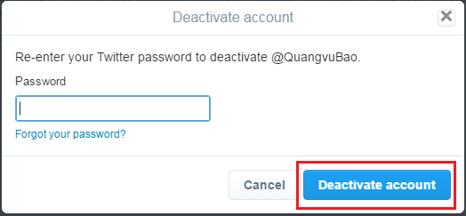 Bước 4: Twitter sẽ hiển thị thông báo xác nhận lại mật khẩu, bạn điền mật khẩu của bạn vào sau đó chọn Deactivate account