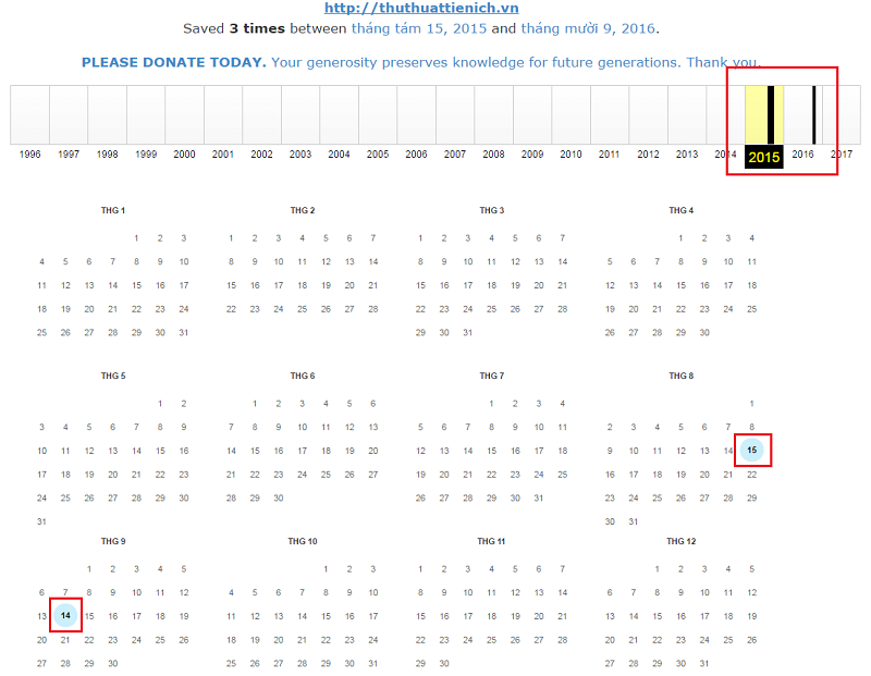 Các ngày khoanh đỏ phía dưới tương ứng với ngày mà web.archive đã đưa vào cơ sở dữ liệu lịch sử của website đó, trên hình web.archive đã lưu lịch sử ngày 15 tháng 8 và ngày 14 tháng 9 năm 2015. Để kiểm tra lịch sử của website bạn click vào ngày được đánh dấu, lưu ý rằng website hoạt động càng mạnh thì web.archive sẽ lưu lịch sử càng nhiều.