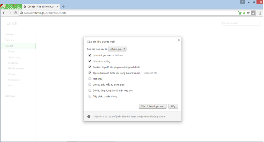 Bước 2: Nhấn tổ hợp phím ctrl+ Shift +delete. Hoặc ctrl + H sẽ có giao diện giống như sau: