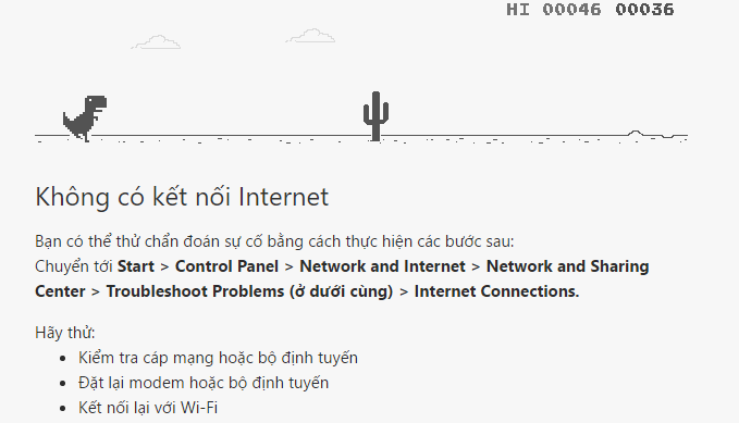 Bạn chắc chắn đã không ít lần bị mất kết nối internet và không thể duyệt web được, trong các trường hợp đó thường bạn sẽ đi làm việc khác trong khi chờ đợi có internet trở lại. Tuy nhiên bạn có biết rằng mỗi khi trình duyệt Chrome không kết nối được internet bạn có tể chơi game T-Rex trực tiếp trên trình duyệt đó không? Google hẳn rất tâm lý khi đưa game này để bạn có thể giải khuây khi máy tính của bạn không có kết nối internet đấy.