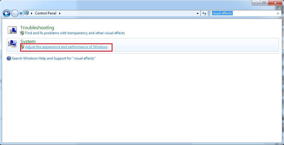 Bước 2: Tại cửa sổ Control Panel bạn gõ visual effects vào ô tìm kiếm sau đó chọn Adjust the apperance and performance of windows