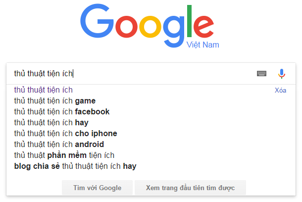 Ví dụ trên cho thấy khi tôi vào Google Search và tìm từ khóa thủ thuật tiện ích thì sẽ có hàng loạt các từ khóa liên quan tới chủ đề mà tôi tìm kiếm như thủ thuật tiện ích game, thủ thuật tiện ích facebook hay thủ thuật tiện ích cho iphone.... Các từ khóa được gợi ý như vậy ta gọi là Google Suggest và việc tìm kiếm các từ khóa liên quan bằng cách này giúp ích cho những người làm SEO rất nhiều.