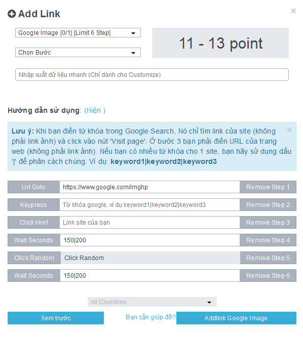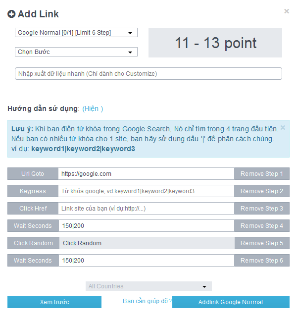 Google Normal: Điều hướng người dùng truy cập vào google.com và tìm từ khóa mà bạn chỉ định, sau đó người dùng sẽ click vào website của bạn thông qua từ khóa tìm được. Sau khi cấu hình xong bạn click Addlink Google Normal