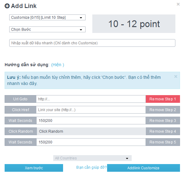 Customize: Đây là phần bạn có thể tùy chỉnh cấu hình các bước di chuyển của người khác khi vào website của bạn (có thể từ web A -> web B-> web cần SEO), đây thực sự là tính năng rất thú vị vì sẽ giúp website của bạn đa dạng nguồn truy cập hơn. click Addlink Customize sau khi đã thiết lập xong.
