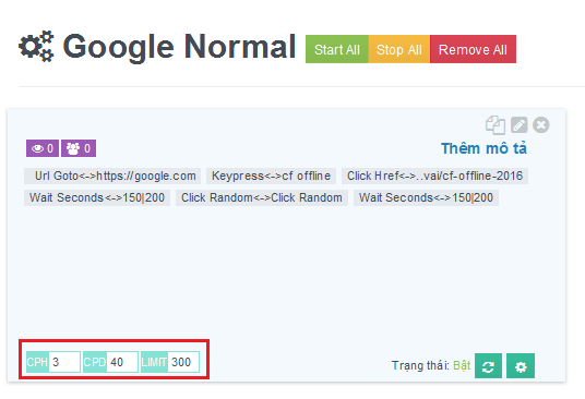Khi Traffic4seo hiển thị biểu tượng Play như hình dưới thì bạn có thể sử dụng các tính năng của nó rồi đấy