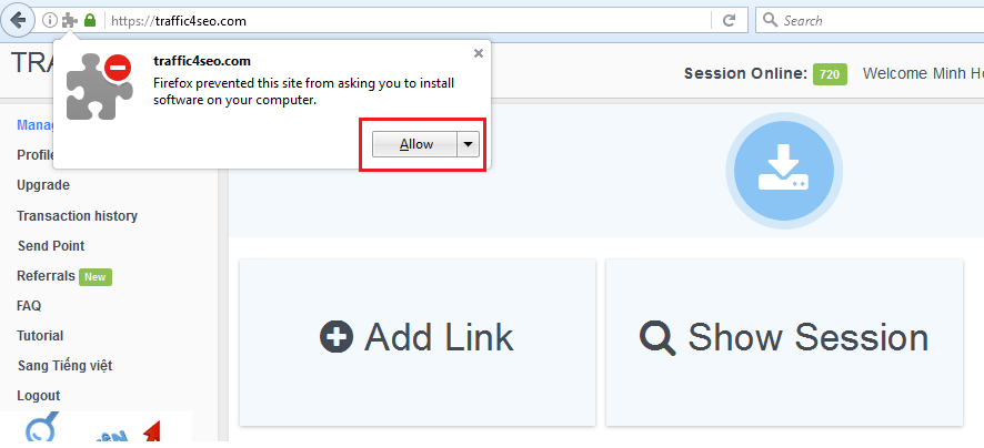 Trước tiên bạn cần truy cập vào website traffic4seo.com bằng trình duyệt Firefox sau đó đăng nhập (bạn có thể đăng nhập bằng tài khoản Facebook hay Google đều được.