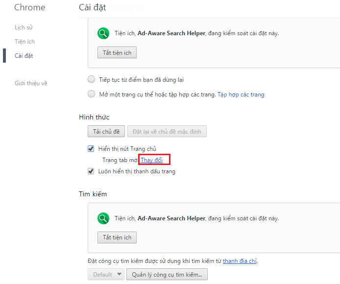 Trong cửa sổ Cài đặt, bạn kéo xuống dưới rồi tích vào Hiển thị nút trang chủ, click Thay đổi