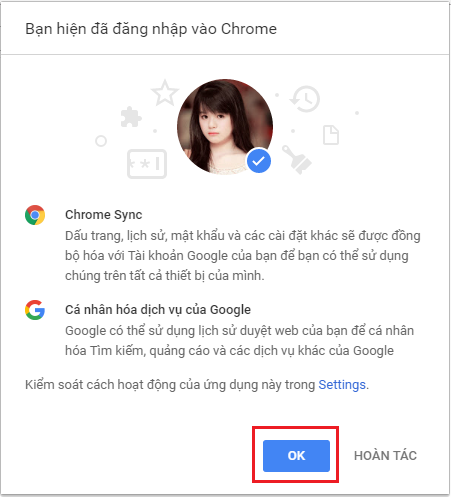 Bước 5: Chrome thông báo tài khoản của bạn đã được xác nhận để tiến hành đồng bộ hóa, click OK để hoàn tất.