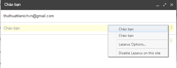 Bước 2: Khi bạn đang soạn thảo văn bản mà bị tắt Chrome đột ngột hoặc mất điện, bạn chỉ việc mở lại khung soạn thảo sau đó click vào logo của Lazarus ở bên cạnh, chọn văn bản cần khôi phục. Tại hình dưới mình thử khôi phục văn bản trên email