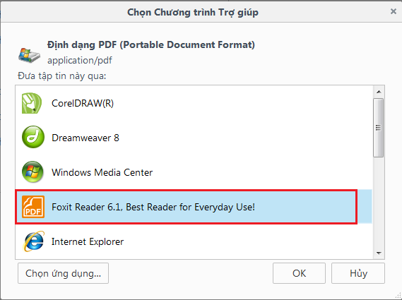 Bước 3: Tại cửa sổ mới hiển thị lên bạn chọn chương trình đọc PDF thay thế (ví dụ mình chọn Foxit Reader) >> click OK