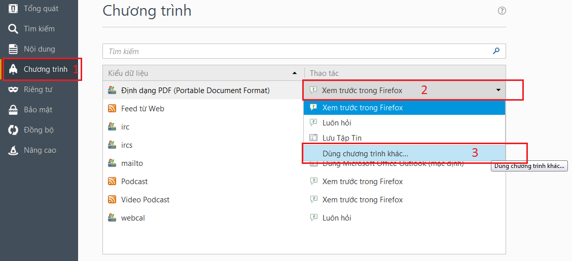 Bước 2: Tại menu bên trái bạn chọn Chương trình, sau đó tại mục Định dạng PDF (Portable Document Format) bạn click chọn Xem trước trong Firefox sau đó chọn Dùng chương trình khác