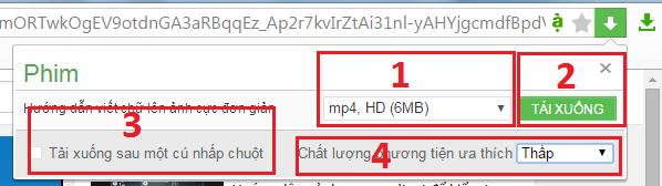 - Vùng số 1: đây là khu vực bạn chọn chất lượng video để bạn download về, bạn có thể chọn chất lượng từ thấp đến cao, chất lượng càng cao thì dung lượng file video càng lớn.