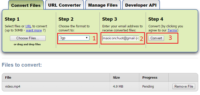 Bước 4: Chọn định dạng đầu ra cho video cần convert(1), điền email của bạn(2) sau đó click Convert(3)