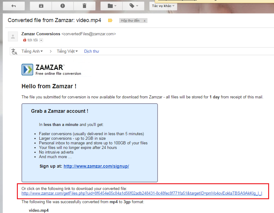 Bước 7: Kiểm tra email bạn sẽ thấy mail của Zamzar gửi đến, click vào link trong email đó