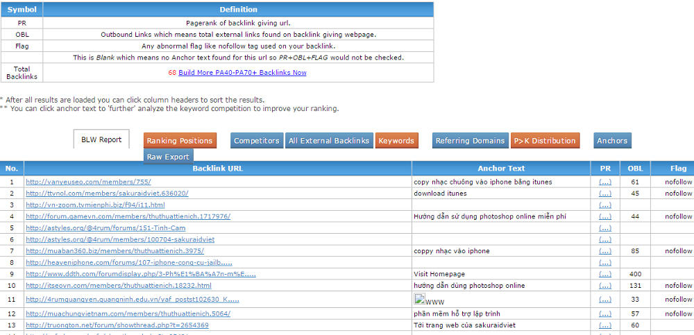 Tại đây BacklinkWatch sẽ hiển thị thông tin về url của backlink, từ khóa (Anchor Text), OBL, Flag của link, dựa vào đó bạn có thể phân tích và biết được điểm mạnh yếu của website.