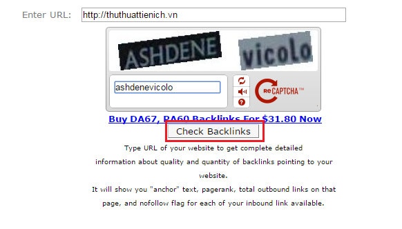 Bạn điền website cần kiểm tra backlink tại ô Enter URL, sau đó nhập mã capcha và click Check Backlinks như hình dưới
