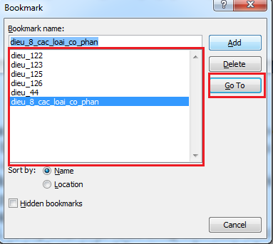 Bước 3: Để tìm lại văn bản đã lưu bạn làm lại giống bước 1, chọn tên bookmark cần tìm sau đó click Go To