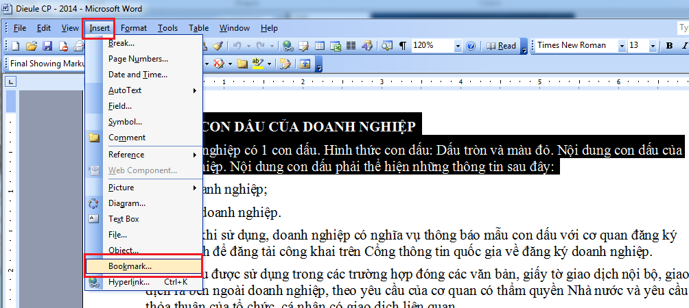 Bước 1: Bạn bôi đen đoạn văn bản cần đánh dấu sau đó click Insert >> Bookmark