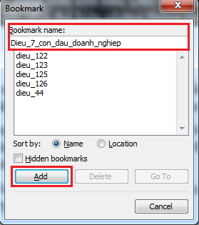 Bước 2: Tại cửa sổ Bookmark, ô Bookmark name bạn điền tên của bookmark, nhớ chọn tên phù hợp với đoạn văn cần tìm để dễ làm sau đó click Add để thêm vào danh sách