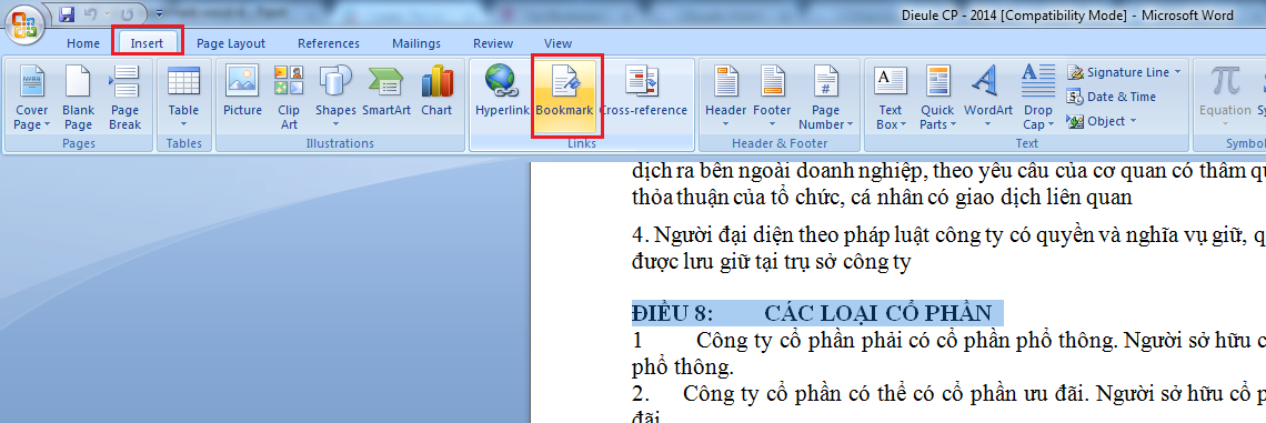 Bước 1: Bạn bôi đen văn bản cần ghi chú bookmark, chọn tab Insert sau đó click chọn Bookmark
