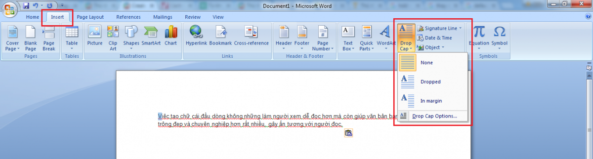 Để tạo chữ cái lớn ở đầu dòng chúng ta cần bôi đen chứ cái cần tạo lớn (thường là chữ cái đầu tiên) sau đó chọn Insert >> Drop cap