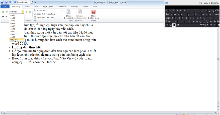 Sau bước 1 ăn bản của bạn sẽ hiển thị dưới dạng Outline. Đặt trỏ chuột trước tiêu đề bạn muốn mục lục tại body text ở góc trái word bạn bấm mũi tên đổ xuống chọn level cho nó. Tiêu đề lớn nhất là level 1 tiếp đó là các level con nhỏ hơn tức mục nhỏ hơn. Cứ level 2 là con level 1, 3 là con của 2 tới các tiêu đề nhỏ hơn là level nhỏ hơn.