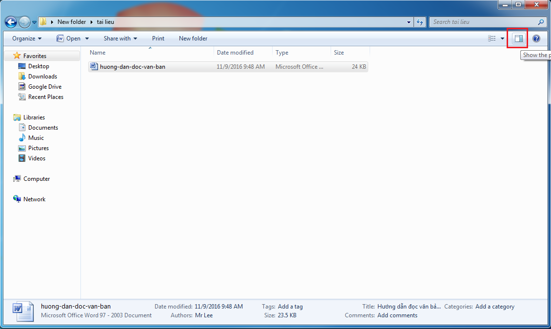 Bạn truy cập vào thư mục chứa văn bản Word cần mở, sau đó click vào biểu tượng Preview Pane tại phía trên bên phải Folder