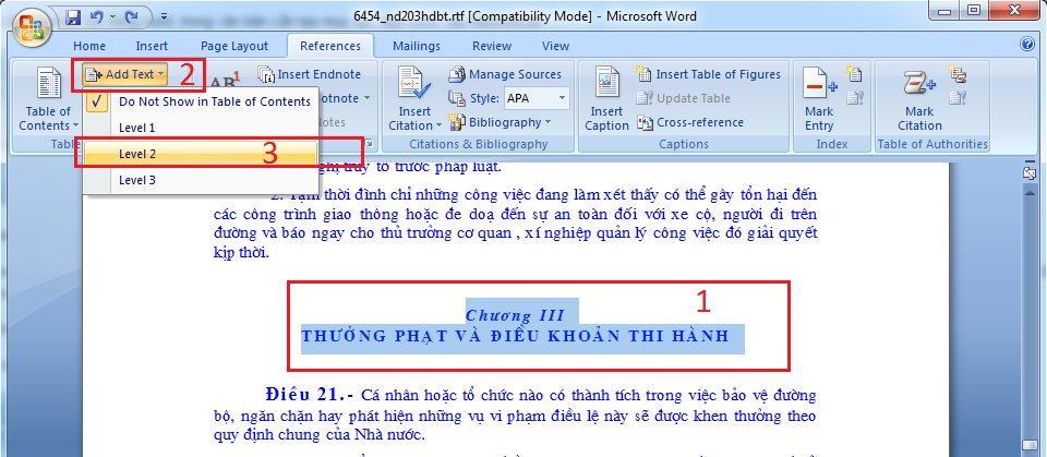 Chú ý: Mục lục được tạo ra tự động trên nguyên tắc cấp độ nội dung chính vì thế khi tạo mục lục bạn phải chọn cấp độ nội dung sao cho phù hợp. Ví dụ với phần mở đầu, nội dung, kết luận bạn chọn lever 1, các phần nội dung nhỏ hơn bạn chọn lever 2, lever 3.