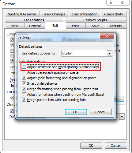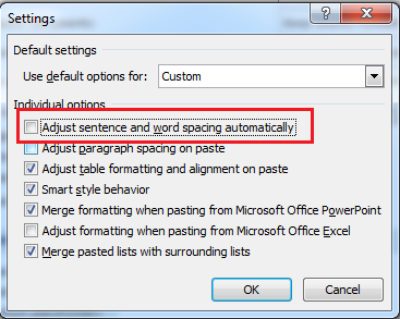 Bước 3: Tại cửa sổ Settings bạn bỏ chọn tại ô Adjust sentence and word spacing automatically >> OK