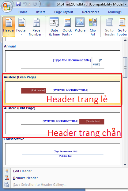 Bước 2: Tại khung Built - In xuất hiện, bạn click vào Austere (Odd Page) để thêm header cho các trang lẻ và Austere (Even Page) để thêm header cho các trang chẵn.