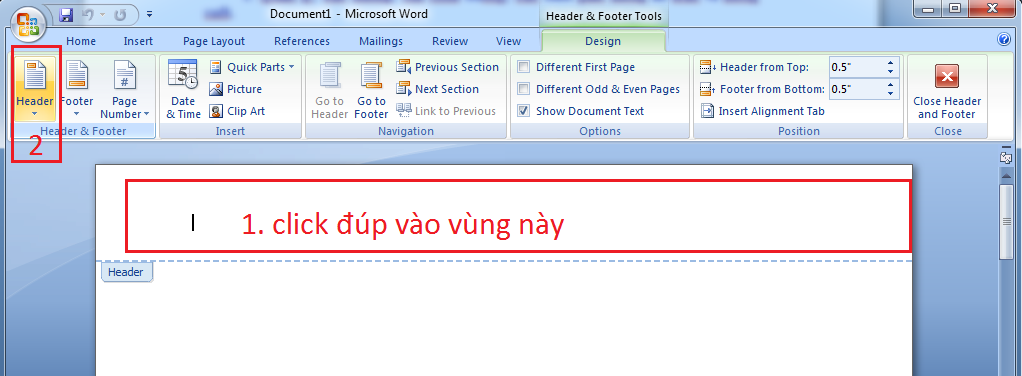 Bước 1: Click đúp vào phần header của một trang bất kỳ trong word 2007 (phần header là phần trống nằm phía trên cùng của mỗi trang), sau đó click vào Header