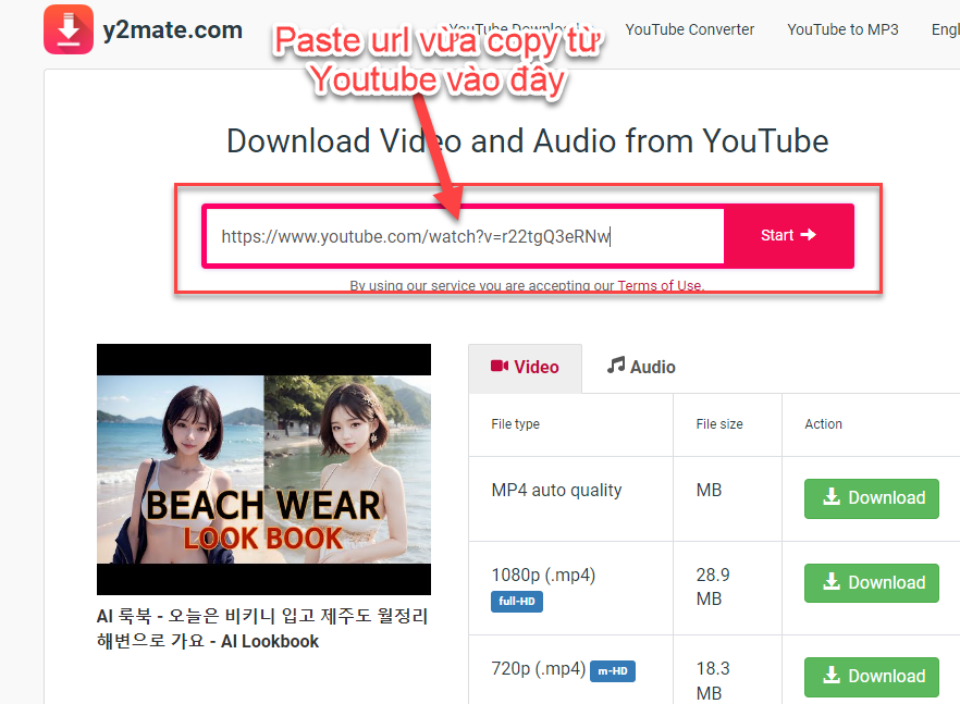 Quay lại y2mate sau đó paste url video vào vị trí như hình trên